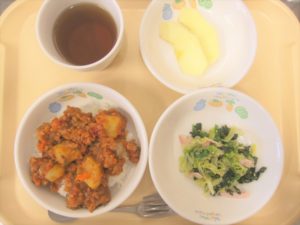 昼食:ドライカレー、ごまサラダ(ほうれん草、キャベツ、ごま、ハム)、りんご(乳児のみ)、麦茶