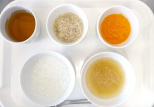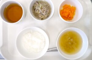 離乳食(中期)午前食:おかゆ、茄子のそぼろ煮、人参煮、キャベツのスープ