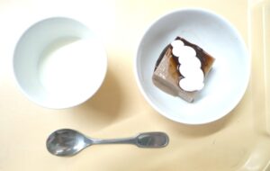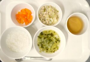 離乳食(中期)午前食:おかゆ、じゃが芋のそぼろ煮、にんじん煮、スープ