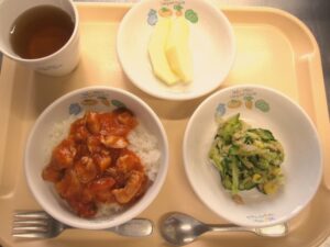 昼食:ご飯、ハッシュドチキン、ツナサラダ、りんご(乳児のみ)、麦茶