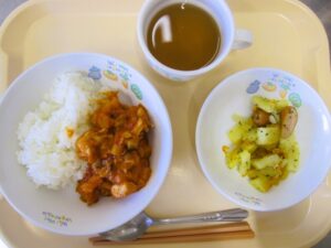 昼食:ご飯、ハッシュドチキン、ジャーマンポテト、みかん(乳児のみ)、麦茶