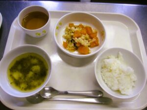 離乳食(後期)昼食:軟飯、つくね団子と野菜煮、ポテトスープ、麦茶