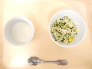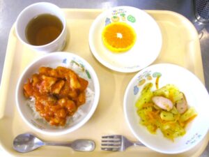 昼食:ご飯、ハッシュドチキン、ジャーマンポテト、みかん(乳児のみ)、麦茶