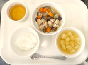 離乳食(後期)昼食:軟飯またはおかゆ、肉団子と野菜煮、スープ(じゃがいも)、麦茶