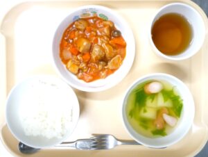 昼食:ごはん、ハッシュドチキン、ポテトスープ、麦茶