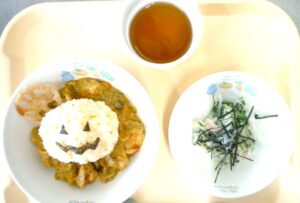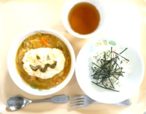 秋野菜カレーにはれんこん、ごぼう、なすなどをたっぷりと使用し、野菜の旨味を活かして味わい深いカレーになりました。みんなが大好きなカレーも具材を変えて飽きないおいしさを工夫しています。