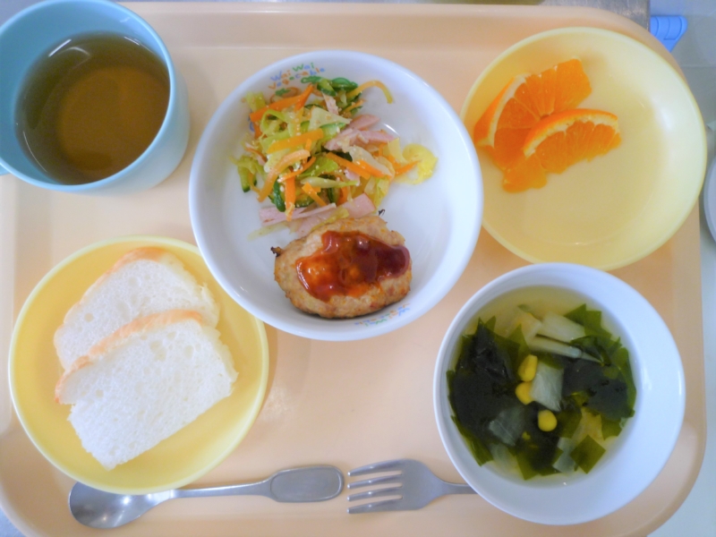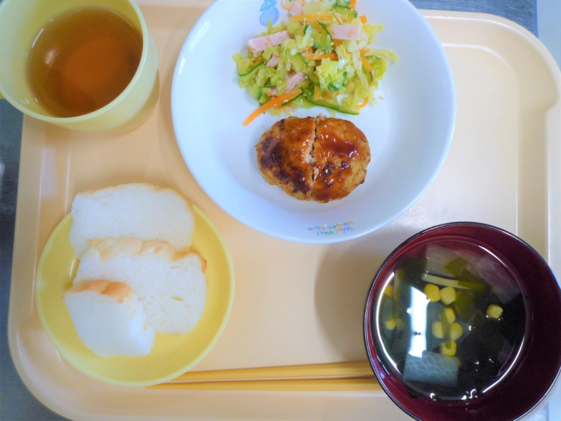 昼食:米粉パン、ハンバーグ、ごまサラダ、スープ(わかめ、大根、コーン)、麦茶