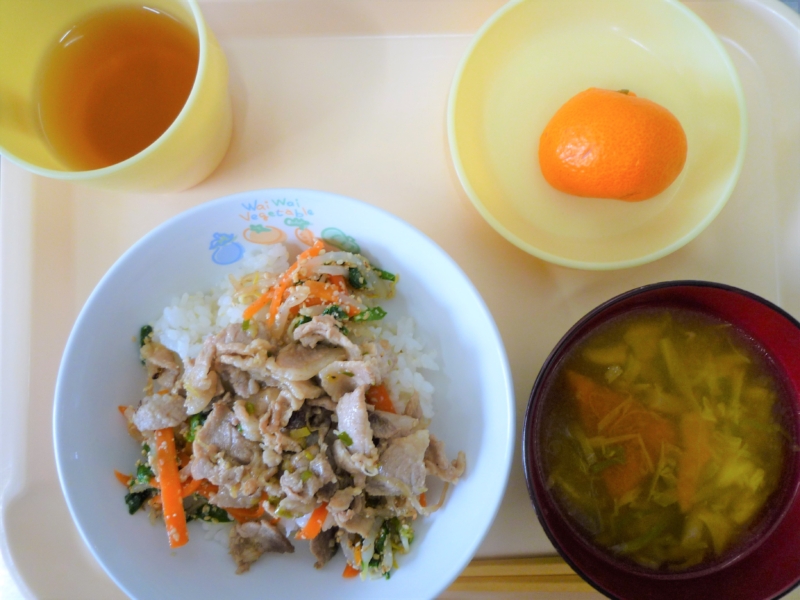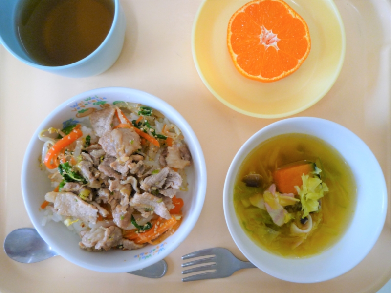 昼食:ビビンバ丼、かぼちゃスープ、みかん、麦茶