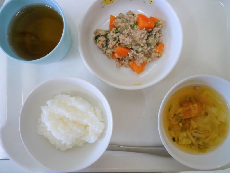 離乳食(後期)昼食:おかゆ、野菜のそぼろ煮、かぼちゃスープ