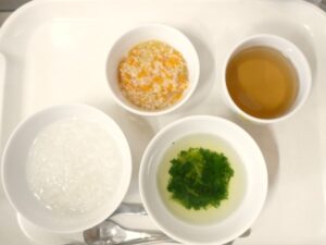 離乳食後期の昼食:おかゆまたは軟飯、野菜のそぼろ煮、スープ(ほうれん草)、麦茶