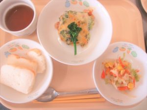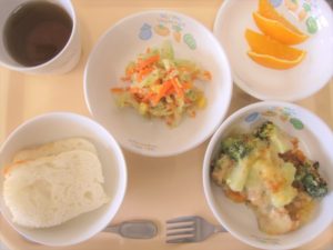 昼食:米粉パン、ポテトグラタン、キャベツとツナのサラダ、オレンジ、麦茶