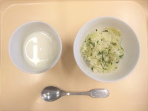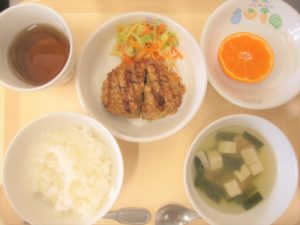 昼食:ご飯、ポテトコロッケ、キャベツのさっぱりサラダ、豆腐とにらのスープ、みかん(乳児のみ)、麦茶