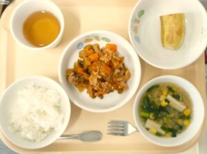 離乳食(後期)昼食:おかゆまたは軟飯、豚つくねと野菜煮、スープ