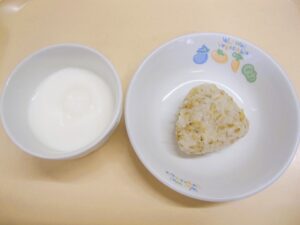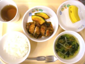 昼食:ごはん、ミートボールのトマト煮、焼きかぼちゃ、スープ(人参、もやし、小松菜、ごま)、バナナ