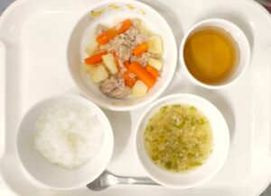 離乳食後期の昼食:おかゆ、つくねとじゃがいも煮物、とろみスープ、麦茶