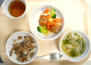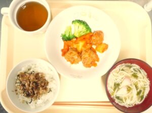 昼食:ふりかけごはん、ミートボールの甘酢あんかけ、あんかけスープ、麦茶