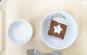 午後おやつ:ココアケーキ、牛乳