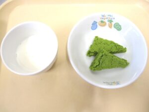 午後おやつ:抹茶パンケーキ、牛乳