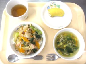 昼食:中華丼、じゃこスープ(ちりめんじゃこ、人参、にら、長ねぎ、コーン)、バナナ、麦茶