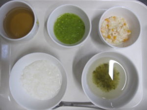 離乳食(中期)午前食:おかゆ、肉じゃが、スナップエンドウ、スープ