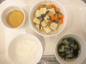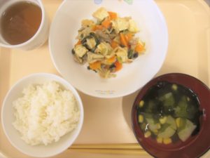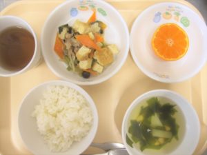 昼食:ご飯、厚揚げのカレー炒め、ポテトスープ(コーン、わかめ、じゃがいも)、みかん、麦茶