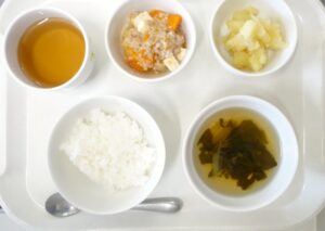 離乳食(後期)昼食:おかゆまたは軟飯、豆腐と野菜のそぼろ煮、じゃが芋煮、スープ