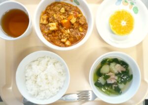 昼食:ごはん、厚揚げのトマト煮、スープ(小松菜、じゃがいも、ベーコン)、みかん、麦茶