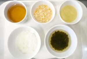 離乳食(中期)午前食:おかゆ、豆腐と野菜のそぼろ煮、じゃが芋煮、スープ