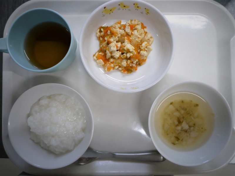 離乳食(中期)午前食:おかゆ、豆腐の野菜煮、かぶのスープ