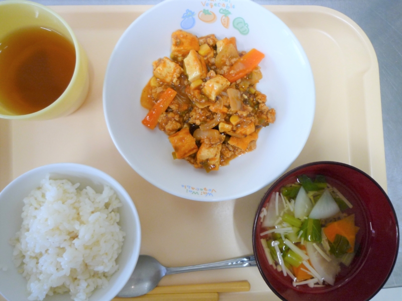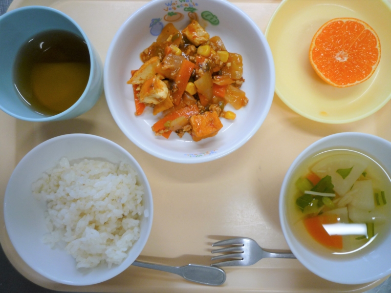 昼食:ご飯、厚揚げのトマト煮、かぶのスープ(かぶ、かぶの葉、えのき、人参)、みかん、麦茶