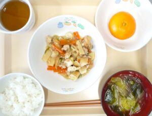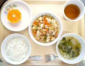 昼食:ごはん、厚揚げの野菜あんかけ、スープ、みかん、麦茶