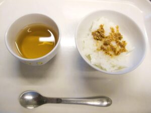 離乳食後期のおやつ:みそおにぎり(粥)、麦茶