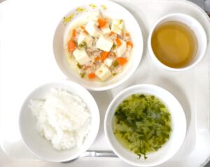 離乳食(中期)午前食:おかゆ、豆腐の野菜あんかけ、わかめスープ