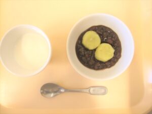 午後おやつ:さつまいも団子のおしるこ、牛乳