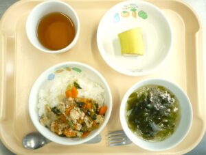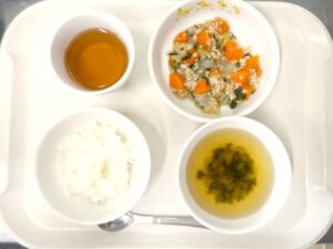 離乳食(後期)昼食:軟飯、野菜の鶏そぼろ煮、わかめスープ、麦茶