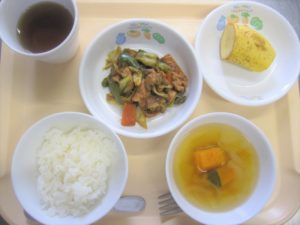 昼食:ご飯、回鍋肉、かぼちゃスープ(かぼちゃ、玉ねぎ、コーン)、バナナ、麦茶