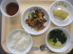 昼食:ご飯、回鍋肉、スープ、バナナ、麦茶