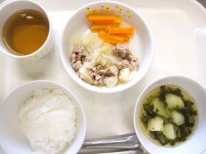 離乳食(後期)昼食:軟飯、肉団子とキャベツの味噌煮、スティック人参、スープ、麦茶