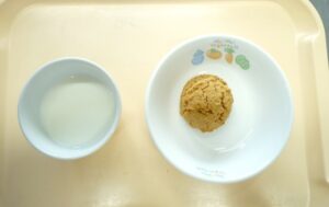 午後おやつ:牛乳、黒糖ごまパンケーキ