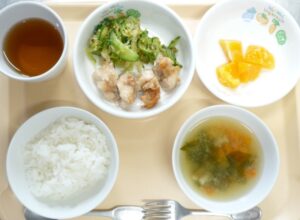 昼食:ご飯、塩から揚げ、和風サラダ、みそ汁(人参、わかめ、しめじ)、オレンジ(乳児のみ)、麦茶