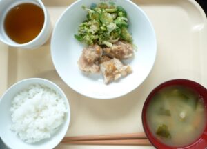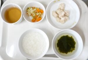 離乳食(中期)の昼食:おかゆ、鶏のつくね煮、おひたし、すまし汁