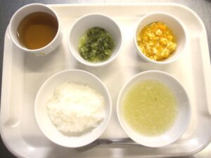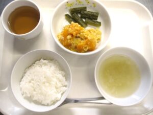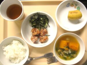 昼食:ご飯、塩から揚げ、和風サラダ、みそ汁(かぼちゃ、万能ねぎ、しめじ)、バナナ(乳児のみ)、麦茶