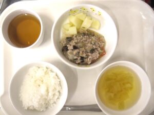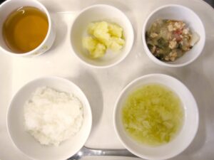離乳食(後期)昼食:軟飯、夏野菜のそぼろ煮、じゃが芋煮、スープ
