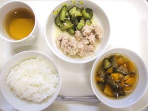 離乳食(後期)昼食:軟飯、肉団子のごま味噌煮、おくらのおひたし、すまし汁、麦茶