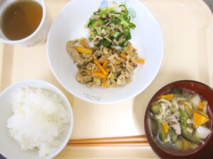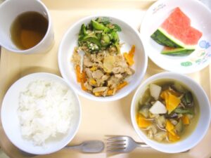 昼食:ご飯、豚肉のみそ焼き、オクラのおひたし、おくずかけ、すいか(乳児のみ)、麦茶