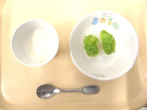 今日の給食は、宮城県の郷土料理です。たくさんの野菜を出汁で煮込み、とろみをつけた『おくずかけ』。午後おやつには、枝豆をすりつぶした、黄緑色のきれいな餡の『ずんだおはぎ』を食べました。
