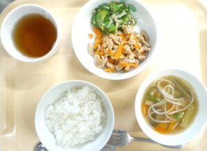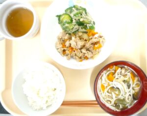 昼食:ごはん、豚肉のみそ焼き、おくらのおひたし、おくずかけ、麦茶