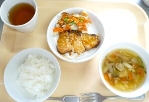 昼食:ご飯、ぶりの照り焼き、かぶのさっぱりあえ、芋煮