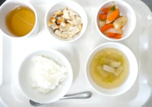 離乳食(後期)昼食:軟飯、かじきの照り焼き、かぶのおひたし、すまし汁