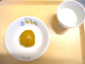 午後おやつ:黒糖まんじゅう、牛乳